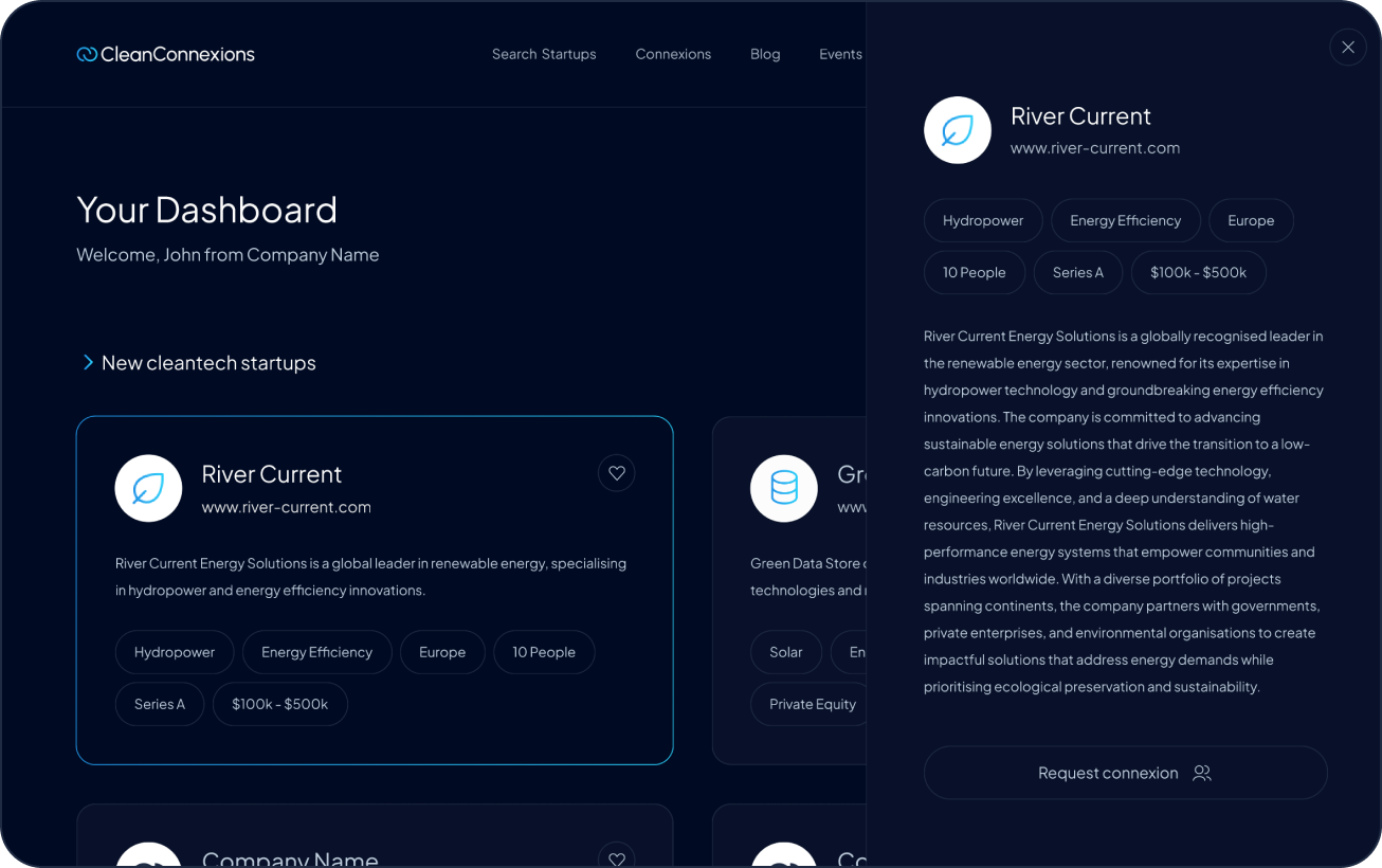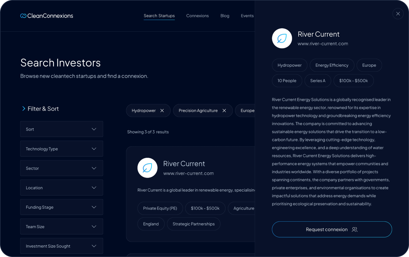 Investors and startups efficiently browse through a curated selection of profiles on the CleanConnexions platform using our advanced search and filtering tools.